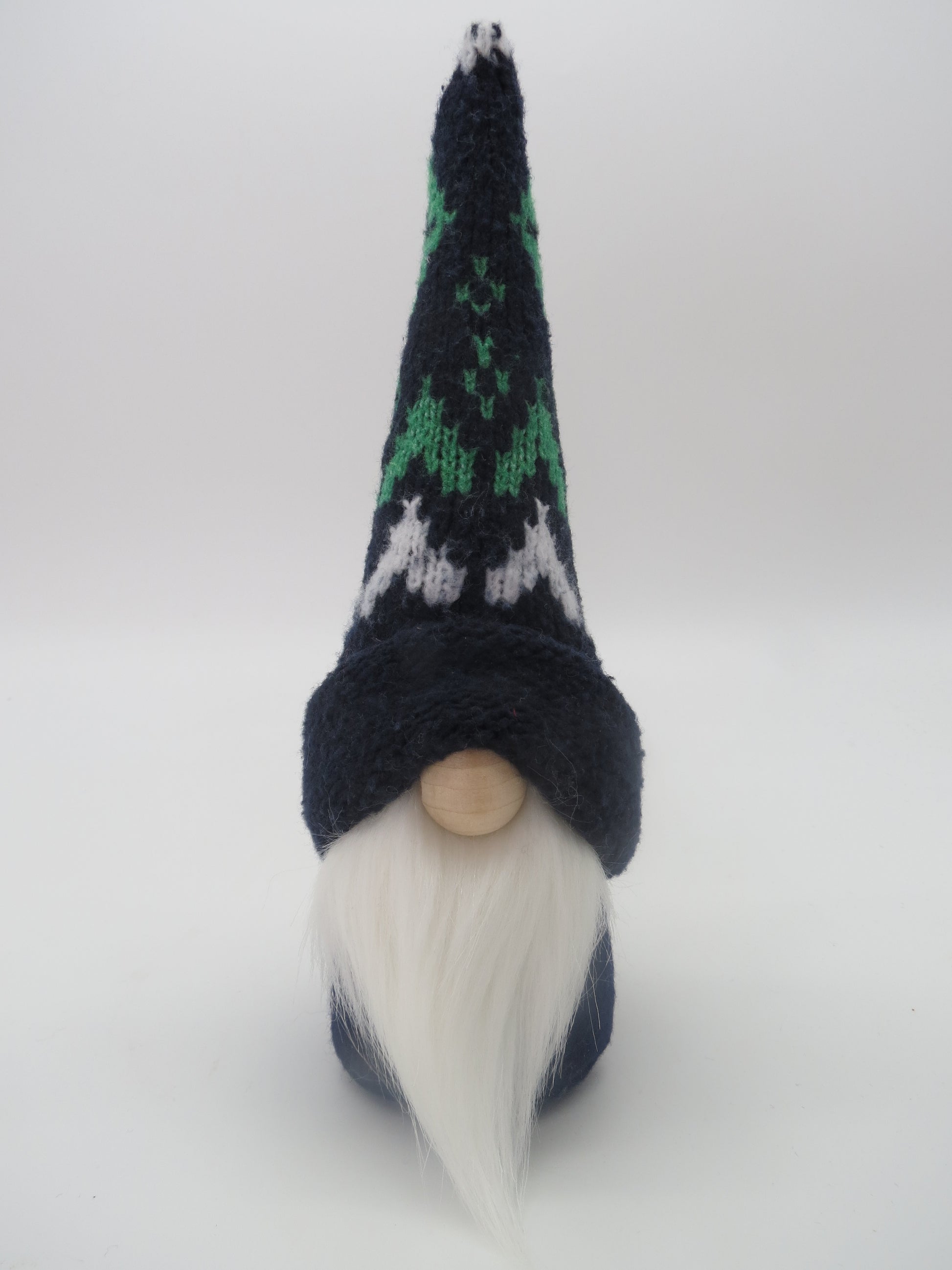 This 10" (25.4 cm) tall gnome has a navy/green/white patterned knit hat, navy felt body, and white faux fur beard and wooden nose.
