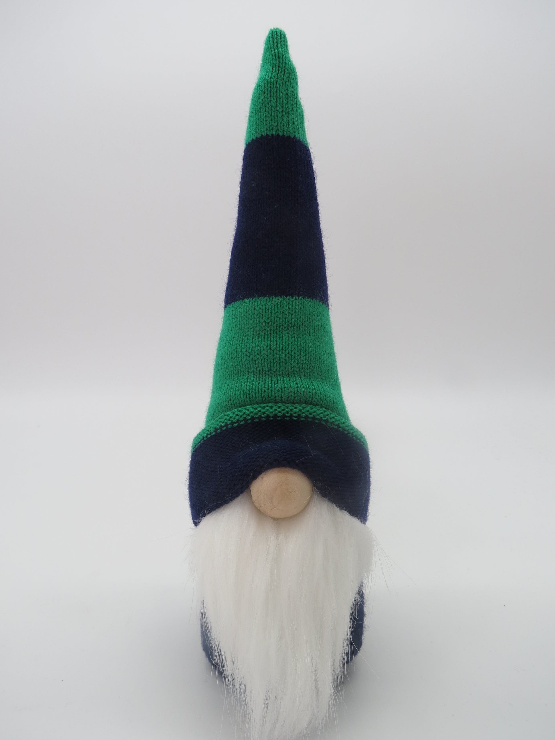 This 10" (25.4 cm) tall gnome has a navy/green stripe patterned knit hat, navy felt body, and white faux fur beard and wooden nose.