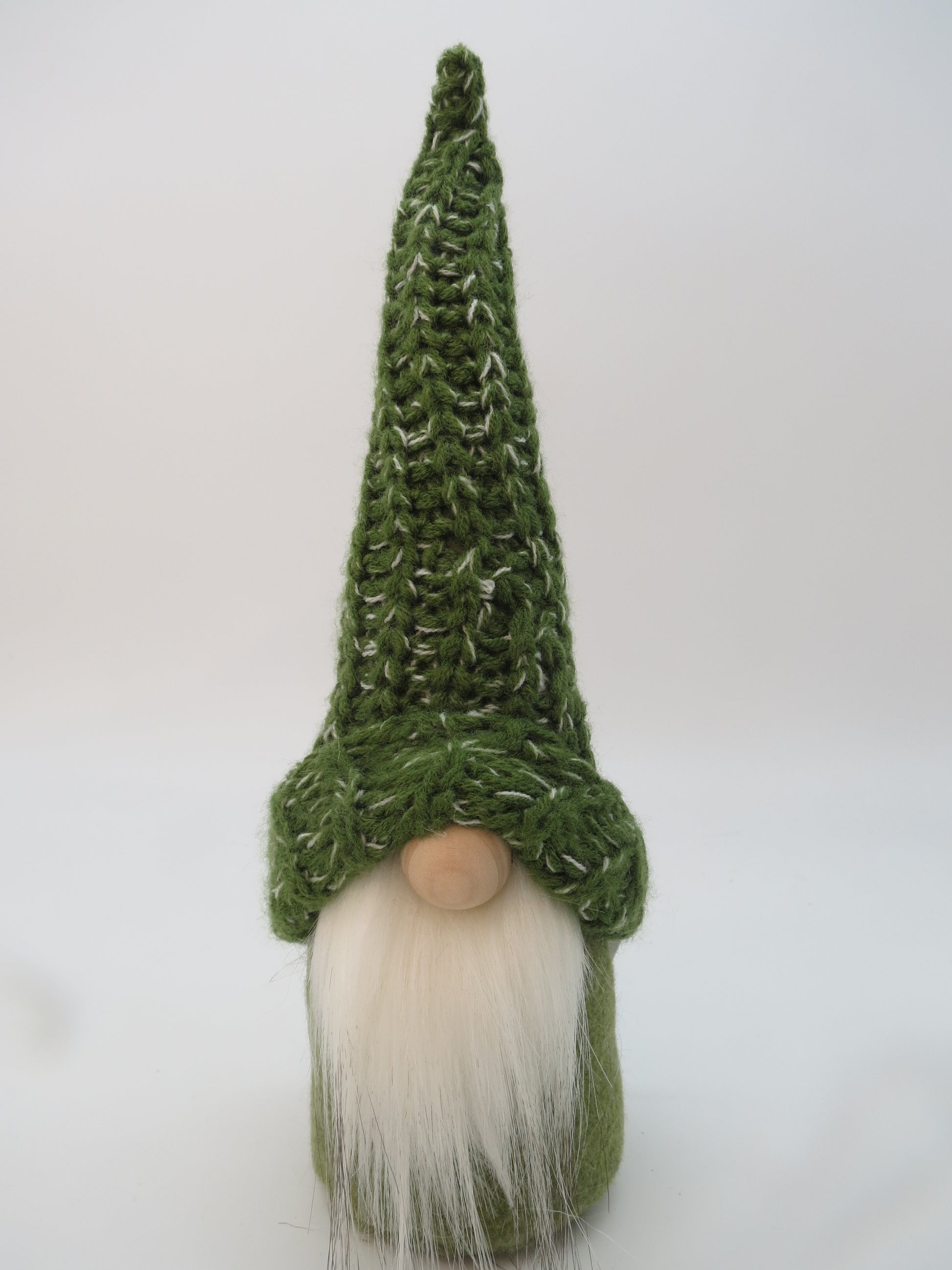 This 10" (25.4 cm) tall gnome has a green with white/black pattern knit hat, olive green felt body, and white faux fur beard with grey streaks and wooden nose.