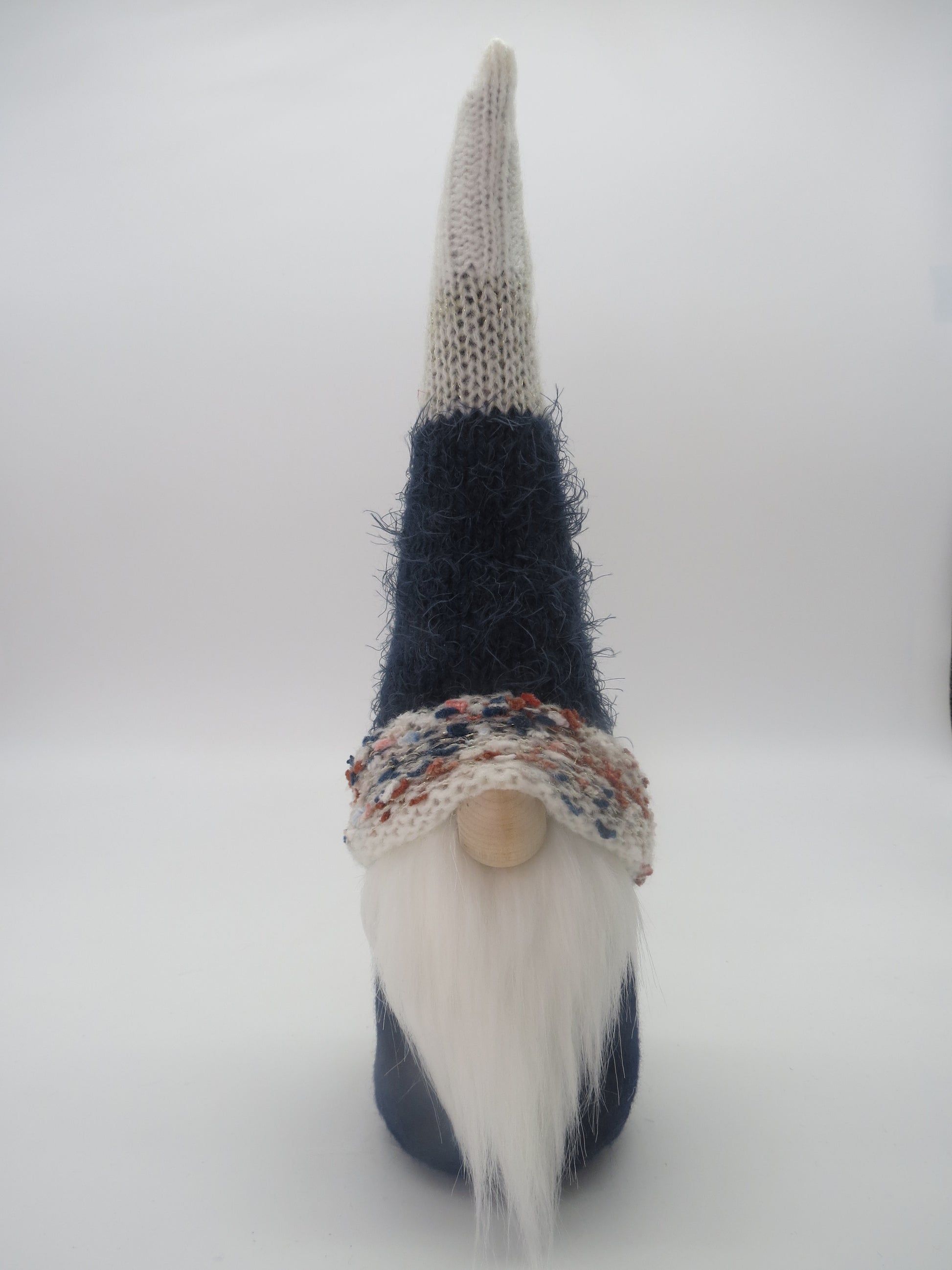 This 15" (38.1 cm) tall medium gnome features a multi colour with sparkles patterned repurposed knit hat, navy felt body, a white faux fur beard, and a wooden nose.